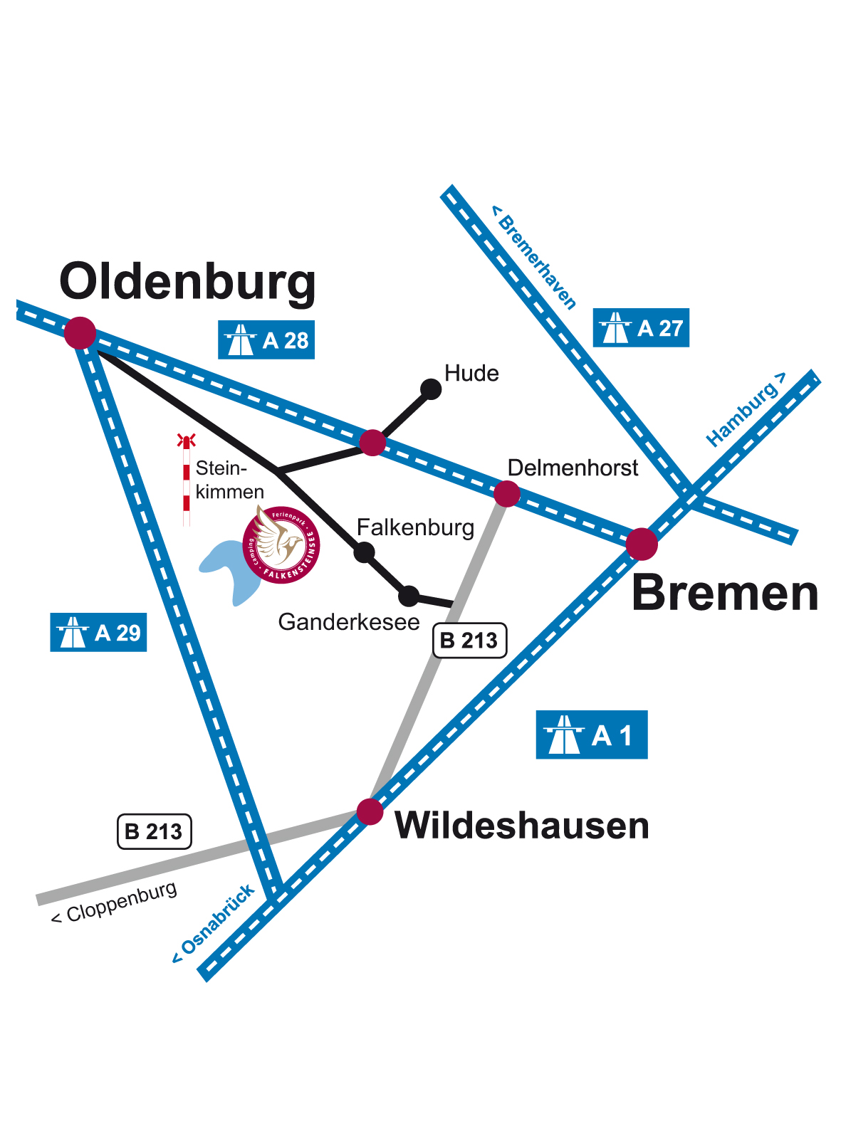 > auf die B 213 Richtung Ganderkesee/Delmenhorst, nach ca. 15 km links abbiegen auf die B212 Richtung Ganderkesee, links abbiegen in die Oldenburger Straße Richtung Falkenburg/Hude, in Falkenburg den Schildern folgen.